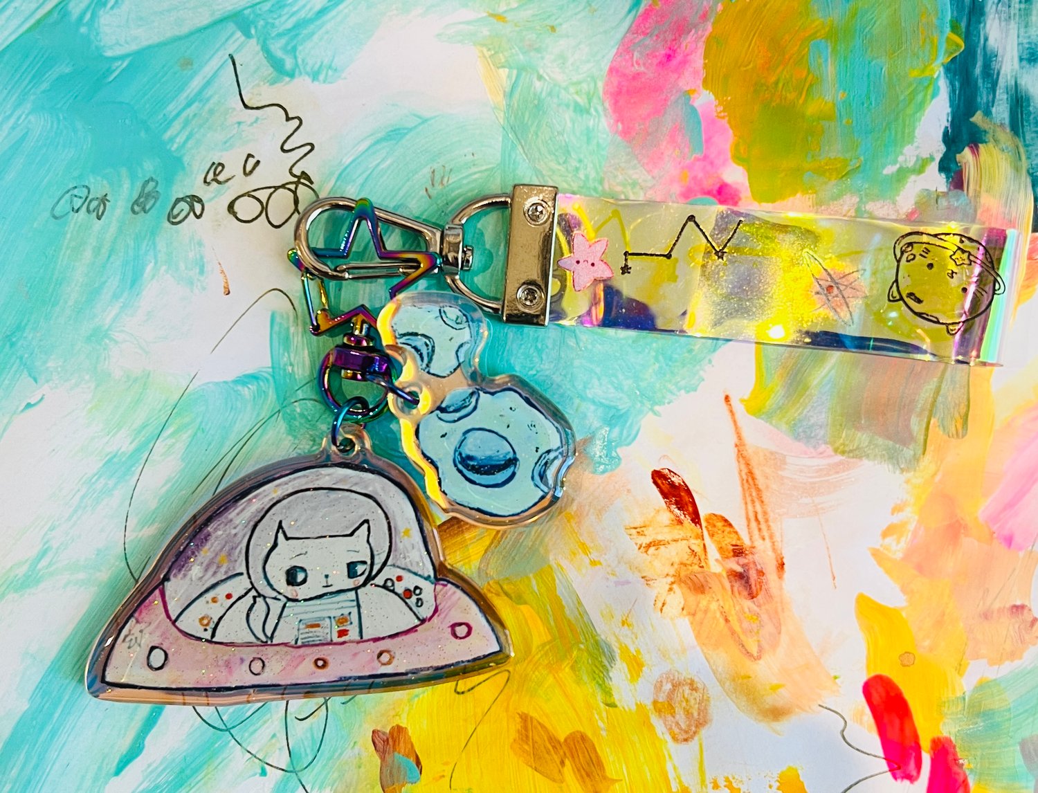 Adorable epoxy charm with lanyard featuring my Cat-er Space collection illustration.