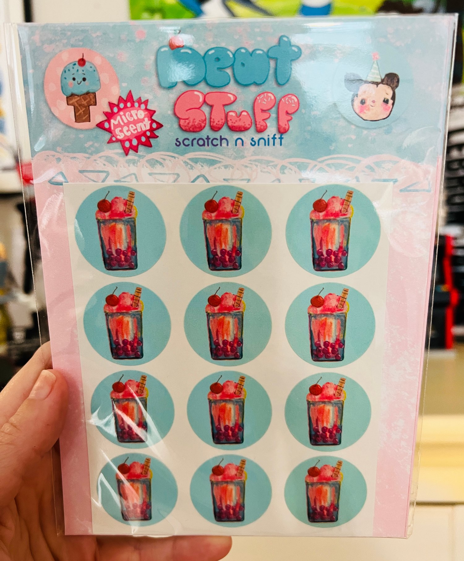 You get 24 1.25" stickers is this pack and they are Strawberry Whip micro-encapsulated scent when scratched.