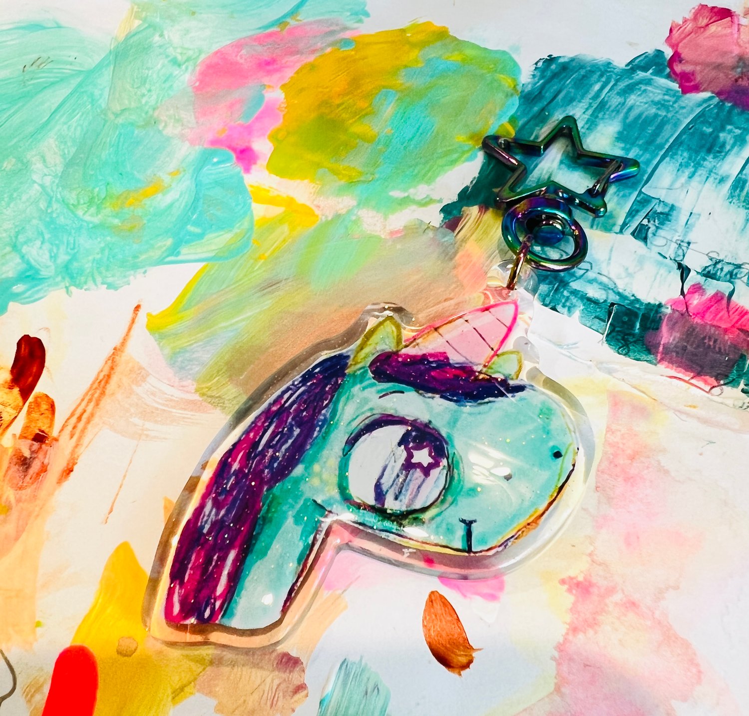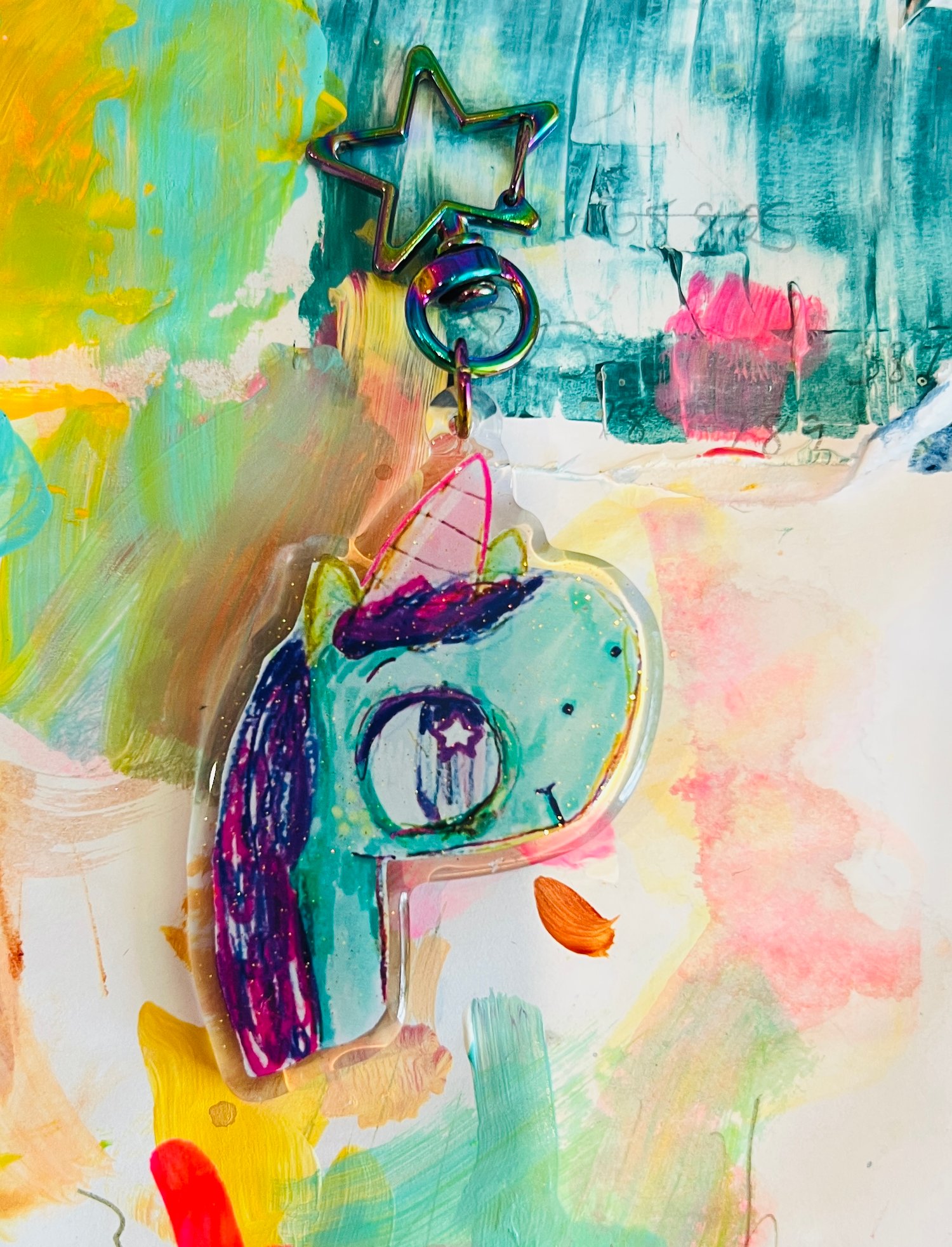 Adorable glitter epoxy charm featuring my cute teal and pink Unicorn illustration.